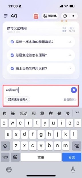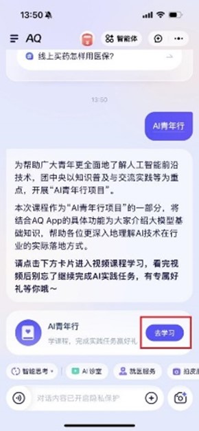 注意:一定要用支付宝扫码,直接在手机应用市场搜索“蚂蚁阿福”进入无效。 二、在对话框中输入“AI青年行”并点击“去学习”