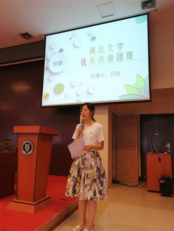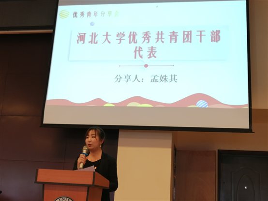开班仪式后,进行了优秀青年分享会。吕佳同学从面对工作、面对学习、面对自己三方面,就如何成为一名优秀的共青团员与大家进行了分享;凡紫瑞同学从支部内良好风气的形成、重视支部的学习、积极鼓励大家参加竞赛和志愿活动等方面入手,与大家分享了如何建设一个优秀的团支部;孟姝其同学以自身经历向大家分享:一名优秀的共青团干部要具备政治素质高、文化底蕴深、个人品德好等素质;吴俊红同学分享了她参加河北大学十佳·百强自强自立大学生评选,并荣获“十佳”荣誉的过程;最后,获得国家“宝钢优秀学生奖”的张宇轩同学,为大家分享了自己获奖的经历,同时从学习、思想、创新、工作以及热心公益等方面分享了自己的成长心得。