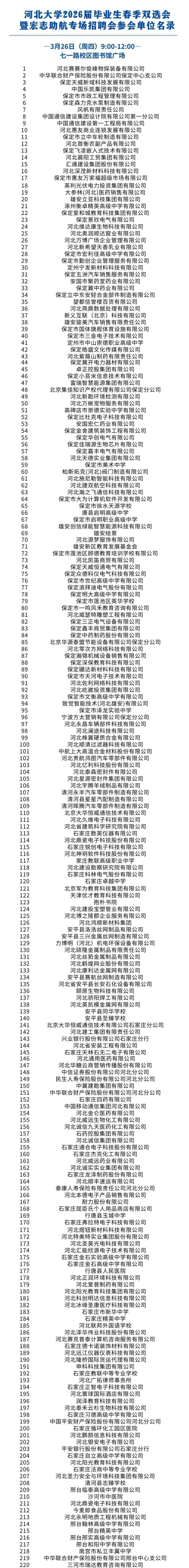 当春风拂过新柳的枝梢学海行舟的HBUers已整装待发属于2026届的职场序章正热烈启幕河北大学2026届毕业生春季双选会暨宏志助航专场招聘会携万千机遇重磅登场诚邀你执"专业"之笔,赴"职场"之约让青春才华与理想offer在春日暖阳中美好邂逅! 01 活动安排 时间:3月26日(周四)9:00 -12:00 地点:七一路校区图书馆广场 02 参会流程 (一)提前准备 抢先逛:扫码用小程序,查看参会企业 明需求:浏览企业岗位,明确用人需求 加意向:确定意向企业,记录展位编号 投简历:把握宝贵机会,提前投递简历 (二)现场面洽 逛展:了解企业信息和用人需求 面洽:面对面与心仪用人单位进一步沟通交流 03 注意事项 (一)备资料 精准匹配心仪岗位,精心打磨多份定制版简历。 (二)护周全 若遇临时需求,随时联系现场工作人员。